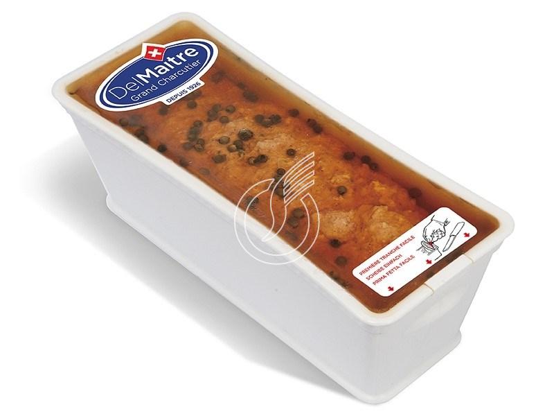 Viande de porc, lard, eau, foie de porc, sel nitrité pour saumure, poivre vert (1,5%), saumure, oignons, fécule de manioc, fécule de pomme de terre, lactose, épices, protéines de lait, gélatine alimentaire, dextrose, arômes, acidifiant